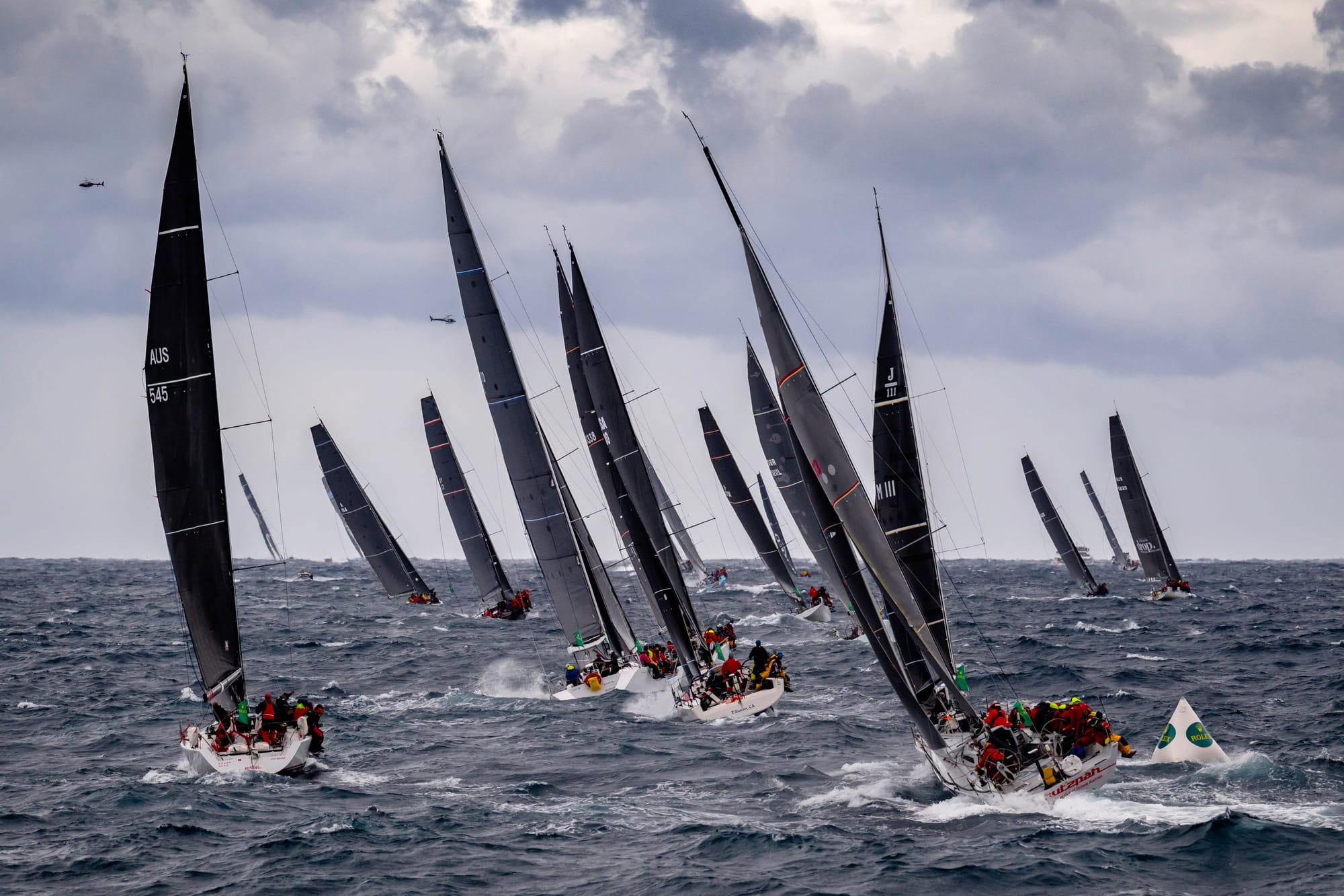 Five 30.5-metre (100-foot) maxis charged off the start line on 26 December, powering down Sydney Harbour under towering sail plans. LawConnect, line honours winner for the previous two years, reached Sydney Heads first and exited into the Tasman Sea closely followed by Comanche, with the smaller 27-metre (88-foot) Lucky in a remarkable third. Their reward was to confront the tumultuous sea state sooner than the rest of the fleet.